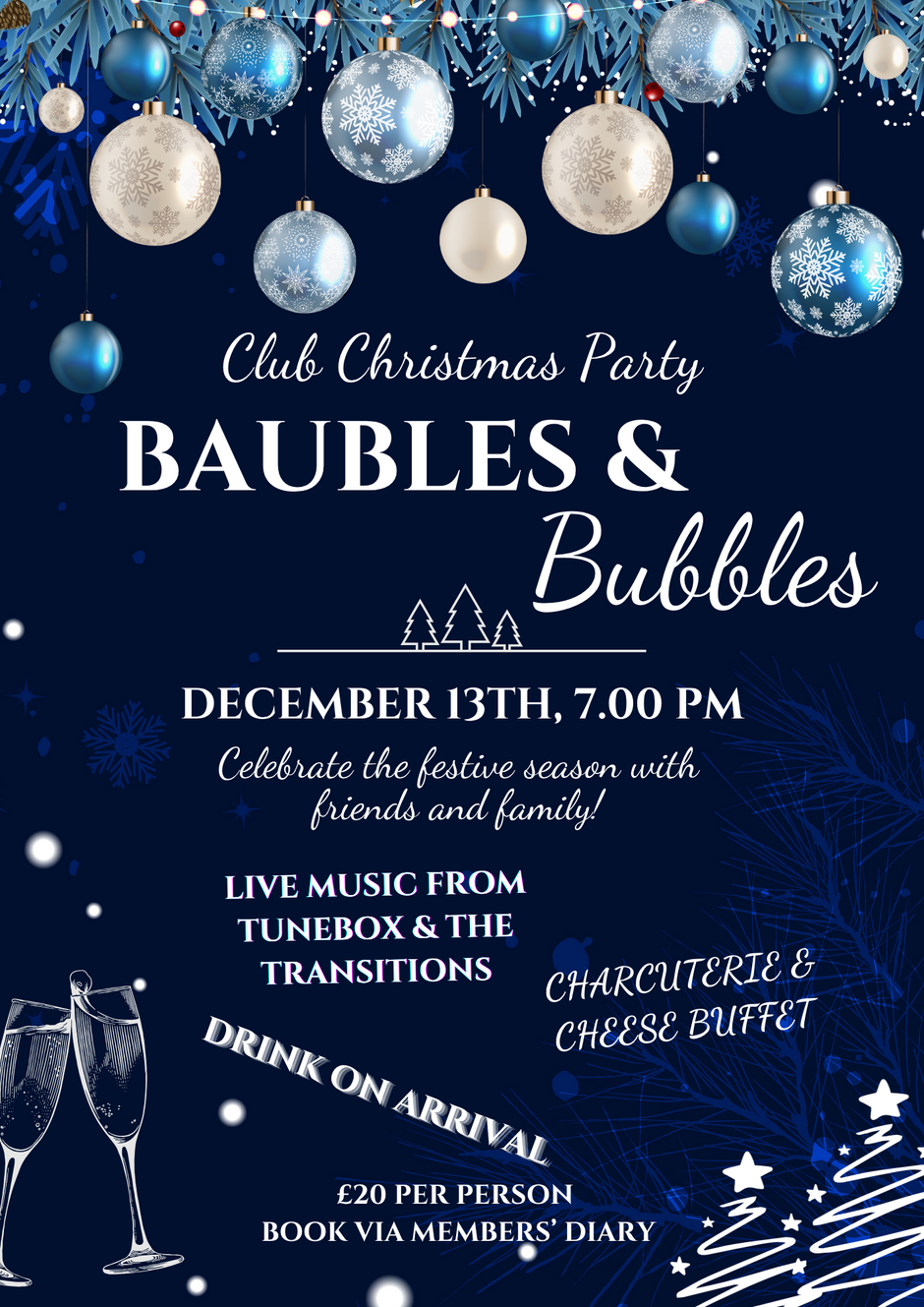 Baubles & Bubbles Christmas Party!Celebrate the Festive Season with Friends and Family! Arrival: Anytime from 7pm, arrival drink. Food: Cheese & Charcuterie Buffet from 8pm.Live Music throughout the evening from TuneBox and The Transitions! £20 per person! |